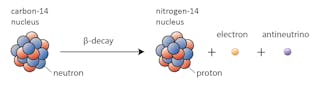 v tomto případě se jeden z neutronů v uhlíku-14 změní na proton a vytvoří dusík-14. Během tohoto procesu, který je známý jako beta rozpad, jádro emituje záření ve formě elektronu a antineutrina.